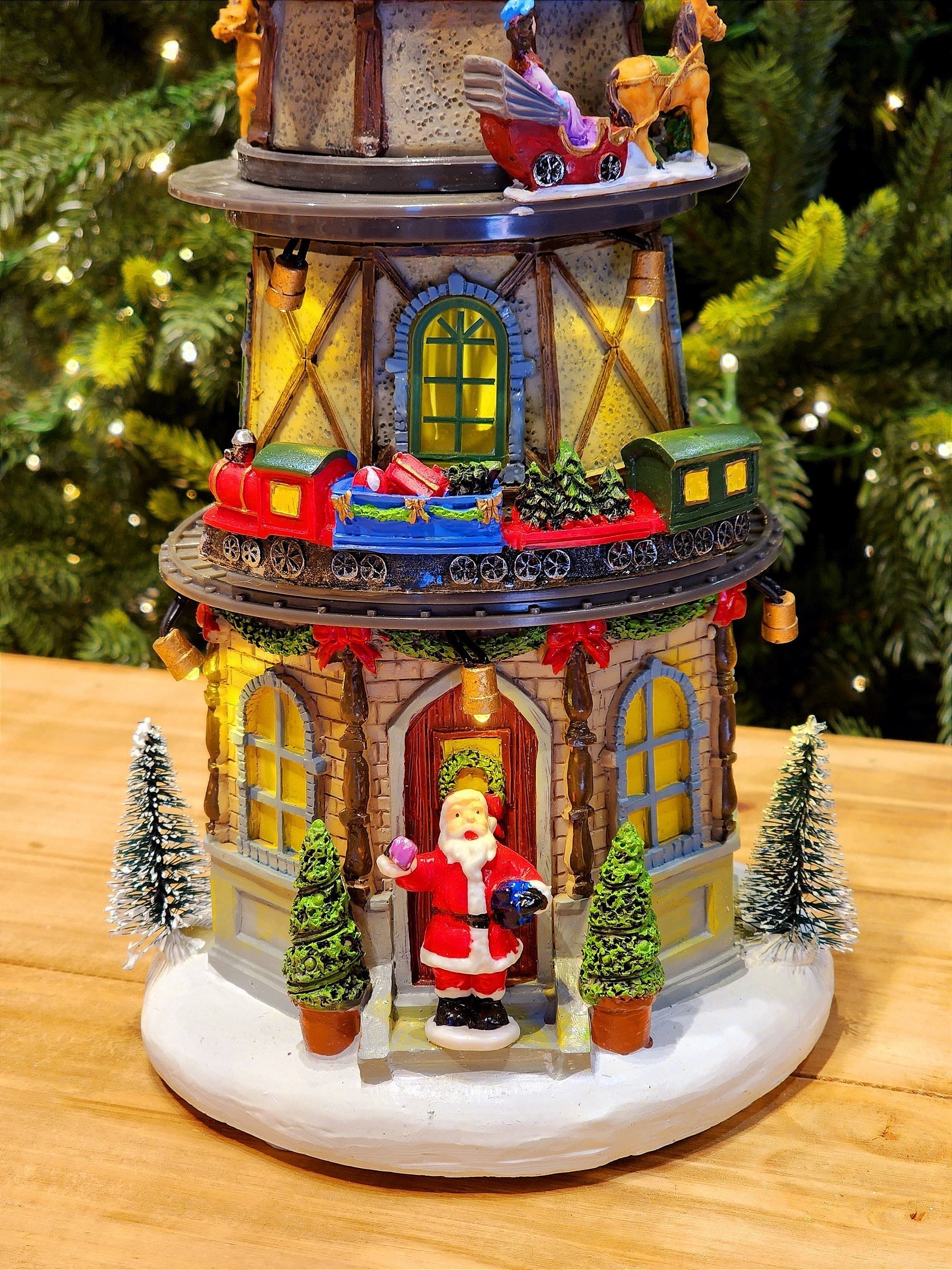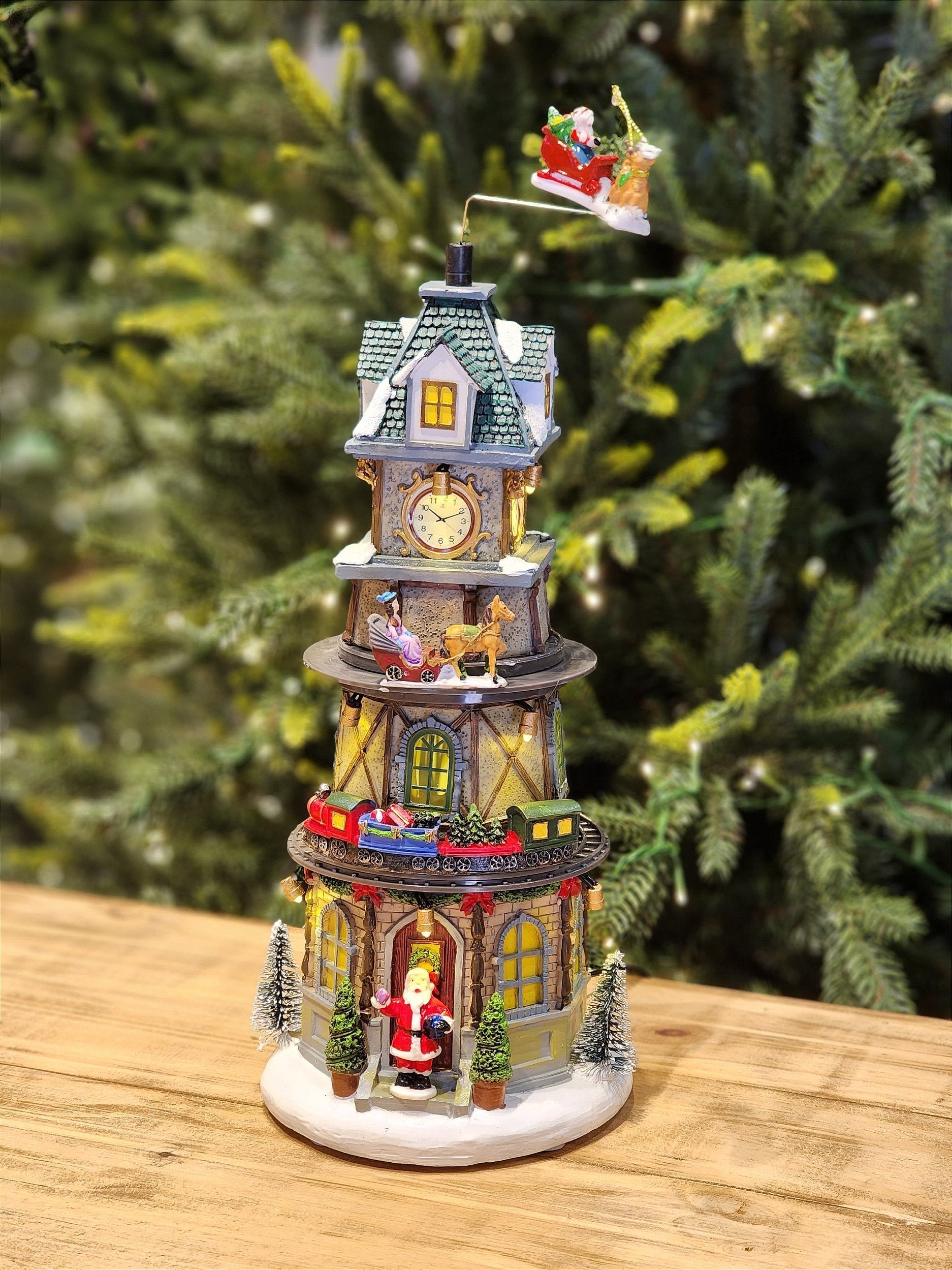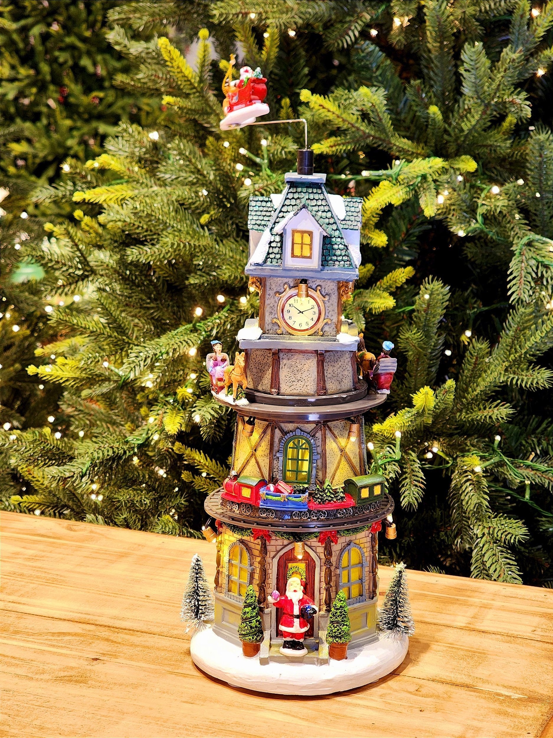 Cenário natalino torre com relógio decorativo, a peça possui movimento do trenzinho em volta da torre e movimento do treno no topo a peça possui luz e som.
